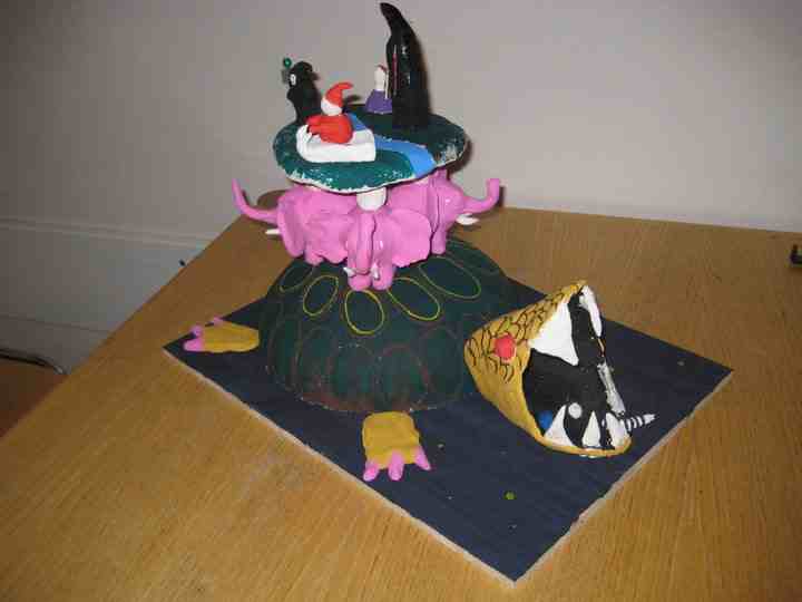 Die gesamte Scheibenwelt und alles auf ihr, besteht aus Ton. Ausser das Universum (die Platte), das ist auch Holz... Der Panzer der Schildkröte ist leider 2 mal kaputt gegangen und wir mussten ihn neu machen... aber schlusendlich bin ich zufrieden